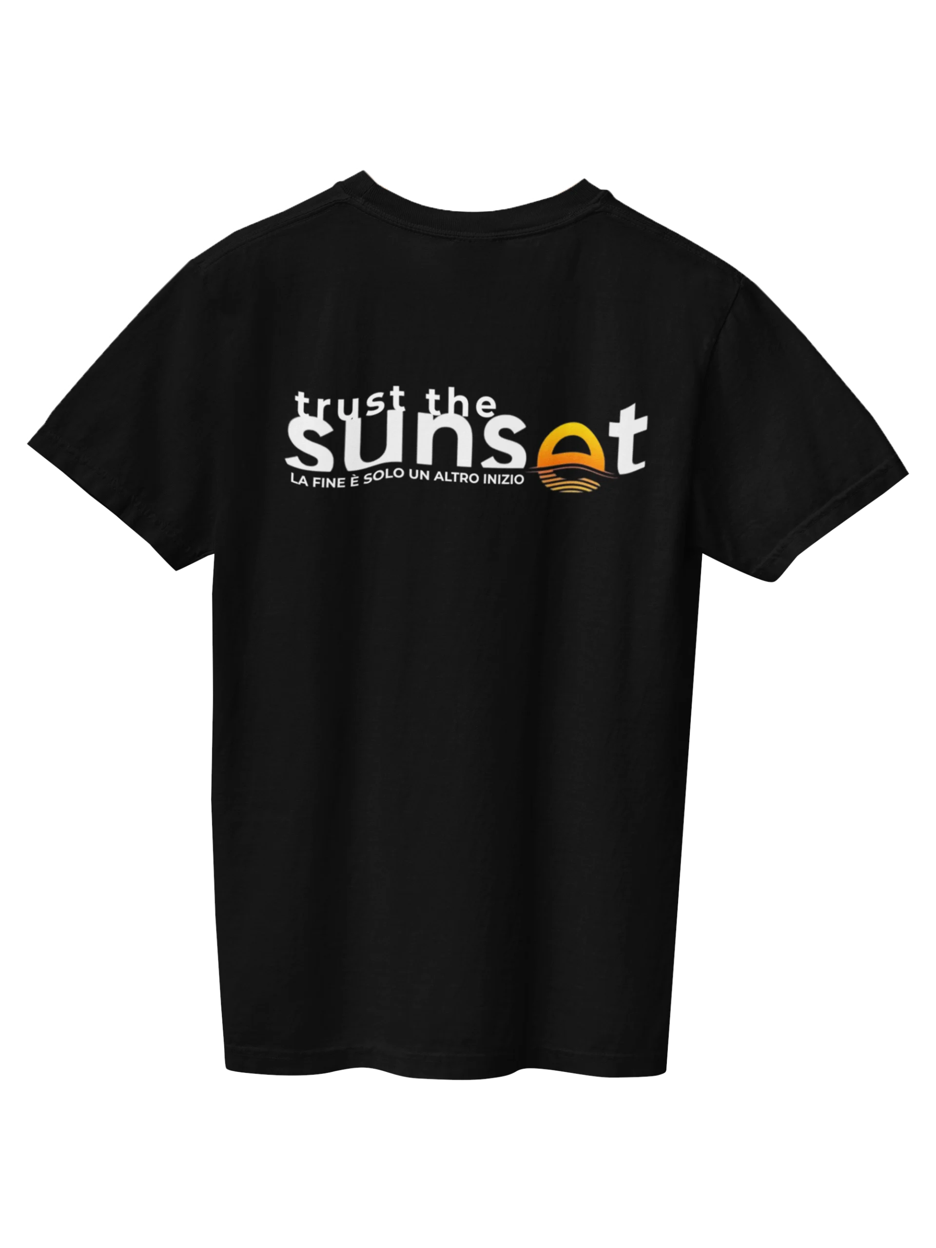 Il design è vibrante, con la parola “sunset” che si dissolve in un tramonto grafico dal colore dorato, accompagnata dal messaggio in italiano che rafforza il concetto: La fine è solo un nuovo inizio. Non è solo una maglietta, è una filosofia da indossare. Per chi non ha paura del cambiamento. Per chi vede opportunità dove altri vedono una fine.